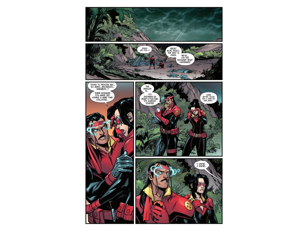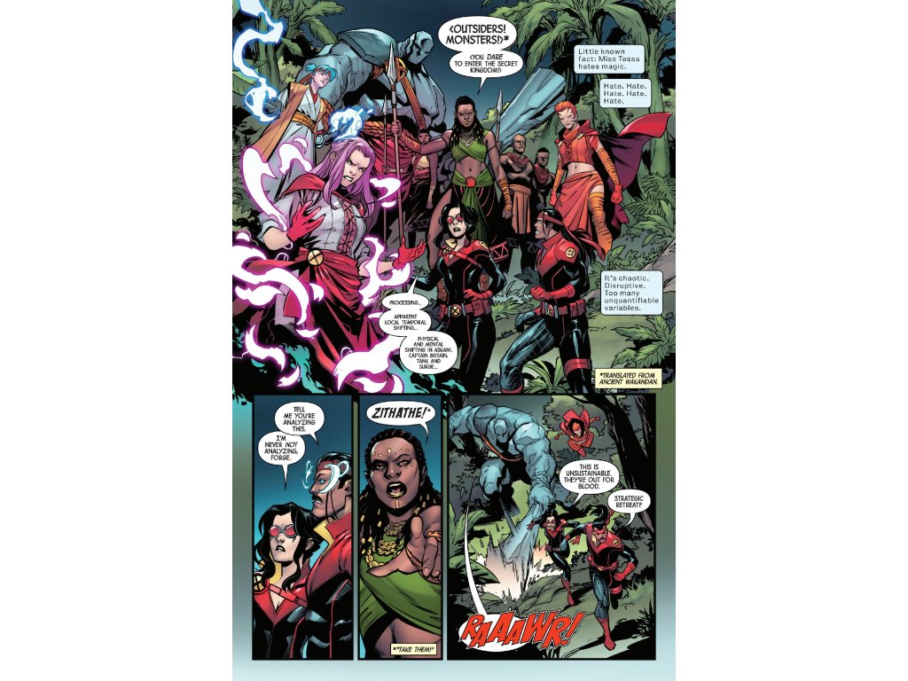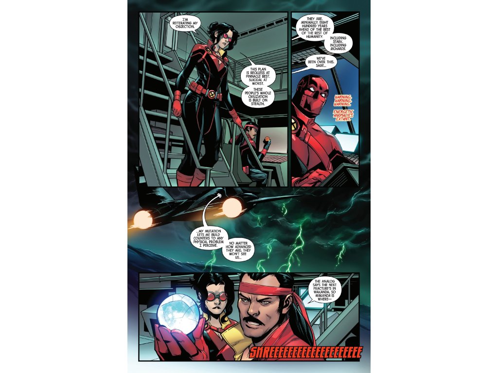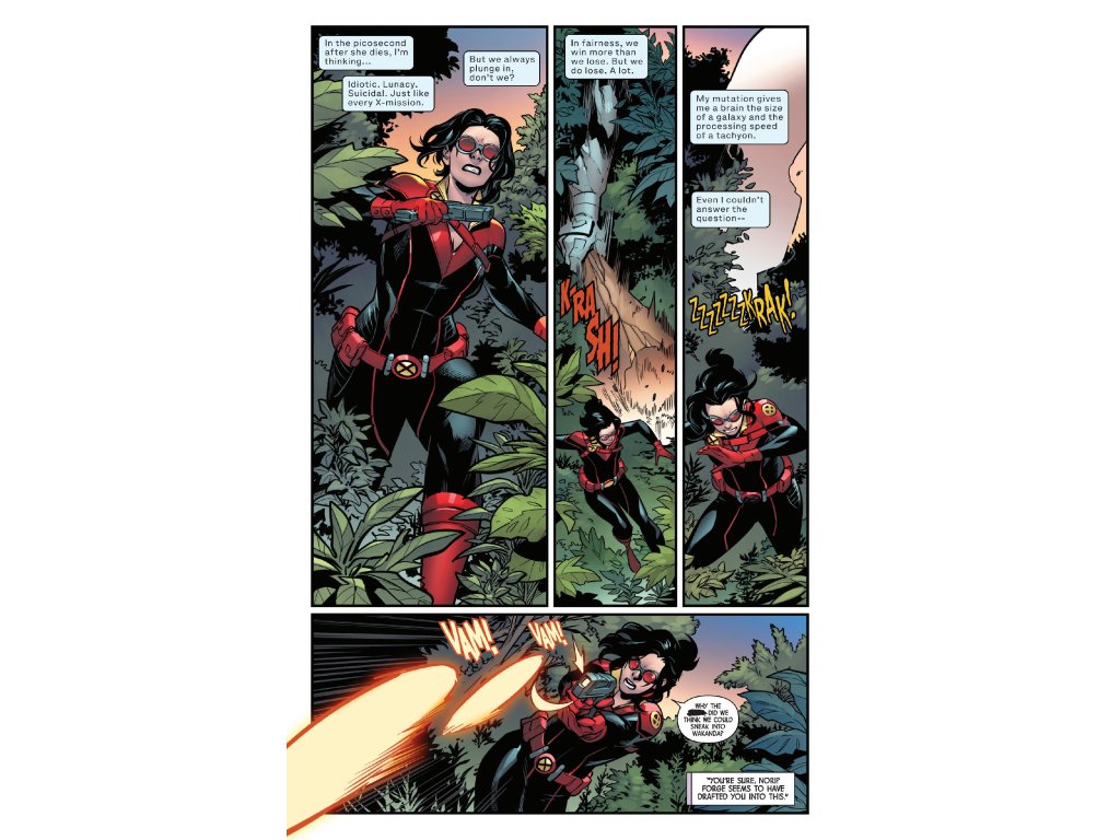 WARFARE IN WAKANDA! FORGE leads X-FORCE in their new, custom BLACKBIRD to the next world fracture in WAKANDA. But as the ground literally changes under their feet, the team will have to stop… the BLACK PANTHER?! That can't be right, can it?! And what secret is bubbling under the surface that just might tear the X-Force team asunder? The new X-FORCE ongoing hits its stride in this issue — don't miss jumping on early!